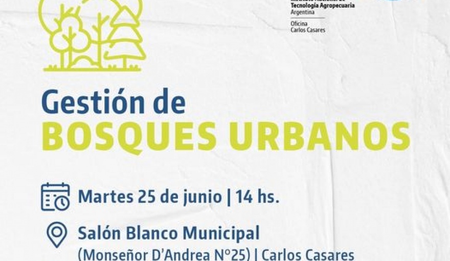 Este martes 25 de Junio, a las 14, en el Salón Blanco Municipal (Monseñor de Andrea 25) de la Municipalidad de Carlos Casares, se llevará adelante una Capacitación de Gestión de Bosques Urbanos.