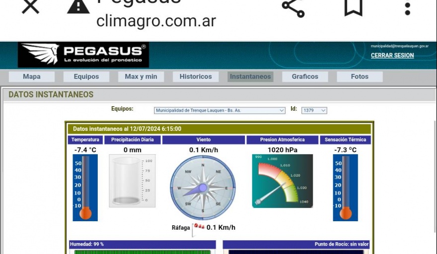 La estación meteorológica instalada en el Club de Planeadores, y que suministra los datos del clima promovidos por el Municipio de Trenque Lauquen mediante la aplicación Pegasus, registró este viernes a la mañana una temperatura de -7,4º.