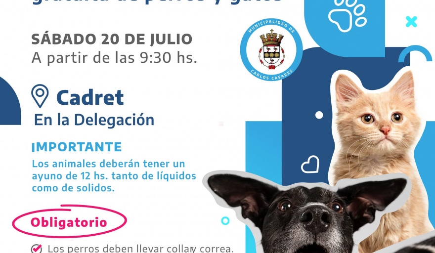 Este sábado 20 de Julio el equipo de castración de la Municipalidad de Carlos Casares estará en la Delegación de la localidad de Cadret. Es en el marco del avance de la castración pública y gratuita de perros y gatos para poder controlar la población y evitar que más animales se conviertan en callejeros.