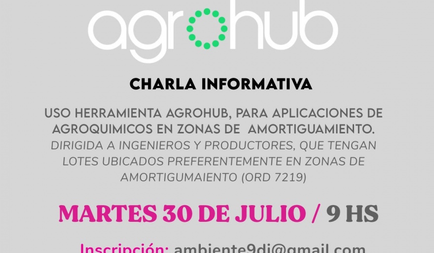 La dirección de Gestión Ambiental de la Municipalidad de 9 de Julio invita a ingenieros agrónomos y productores que tengan sus lotes preferentemente en la zona de amortiguamiento (Ordenanza 7219) a una nueva charla informativa virtual sobre la utilización de la aplicación de AGROHUB, que permite presentación de recetas, seguimiento de aplicaciones de agroquímicos y emisión de actas de condiciones técnicas.