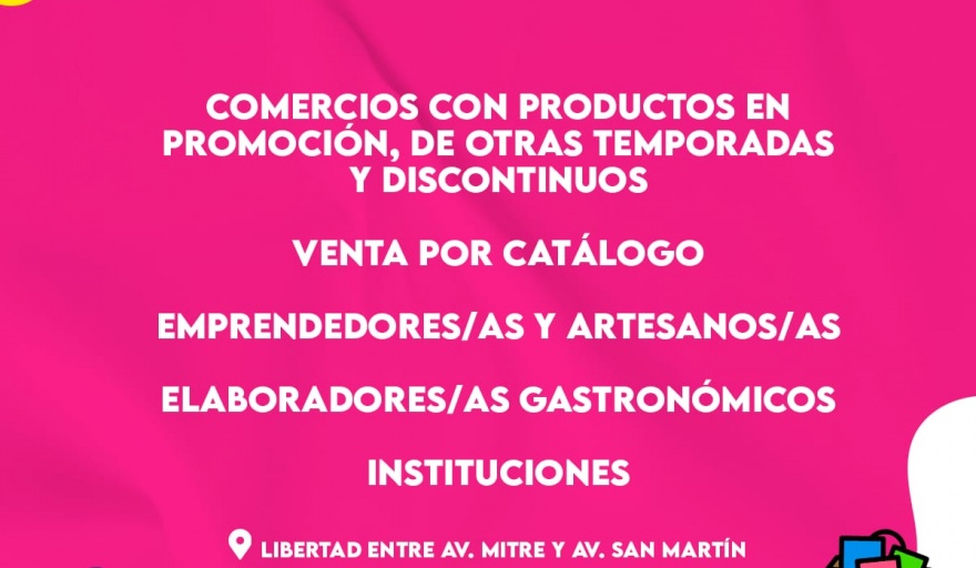 El evento comprenderá la presencia de stands de comercios con productos en liquidación, vintage, de otras temporadas, discontinuos y/o con fallas; vecinos que realicen venta por catálogo; emprendedores y artesanos con carnet; elaboradores gastronómicos con habilitación e instituciones civiles. Se contará además con juegos infantiles y disc jóckey, completando una atractiva oferta para el paseo de la familia.