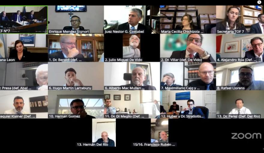 Los jueces Méndez Signori, Fernando Canero y Germán Castelli se conectaron desde una sala de audiencias del Palacio de Justicia en Talcahuano 550, donde ese tribunal tiene su sede y donde minutos antes permitieron el acceso de reporteros gráficos para tomar imágenes.