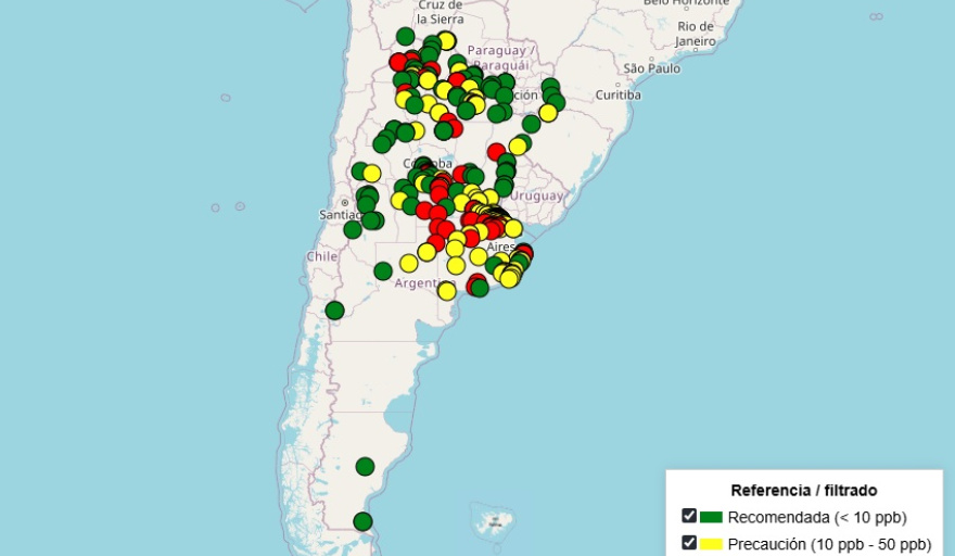 También advierte sobre regiones en “precaución” (amarillo, 10-50 ppb), que se extienden hacia el norte e incluyen partes del norte argentino, como Santiago del Estero, Chaco y Tucumán. Los puntos verdes, en cambio, representan áreas donde los niveles son inferiores a 10 ppb, considerado el límite seguro según los parámetros internacionales.