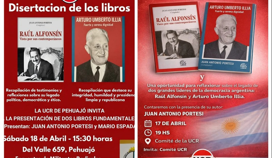 La propuesta incluye la presentación de los libros “Raúl Alfonsín. Visto por sus contemporáneos” y “Arturo Umberto Illia. Fuerte y serena dignidad”, compilados por Juan Antonio Portesi, quien estará presente en los encuentros junto a otros dirigentes.